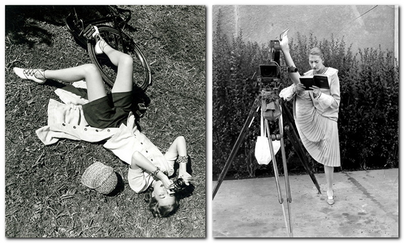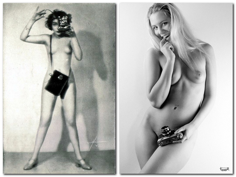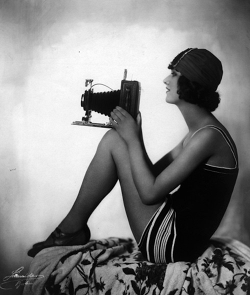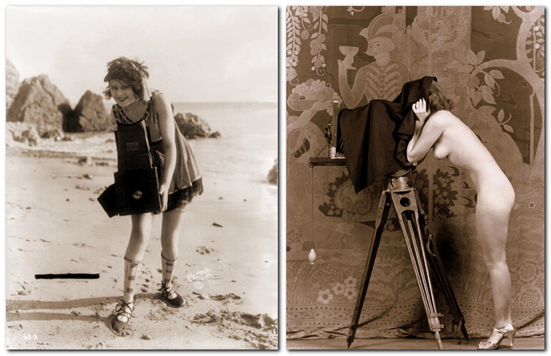 Справа — Женщина и фотоаппарат. Фотограф — Альфред Чейни Джонстон (Alfred Cheney Johnston). Фотография датирована «1920 или ранее». Скорее всего, она сделана после 1917 года, во время работы Джонстона в качестве официального фотографа знаменитого варьете «Ziegfeld Follies».