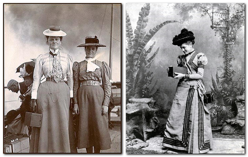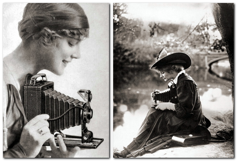 Рисунок 4. Женщины со складным фотоаппаратом типа «Folding Pocket Kodak». Фотографии (приблизительно) датированы: 1910 г. (слева), 1900 г. (справа)